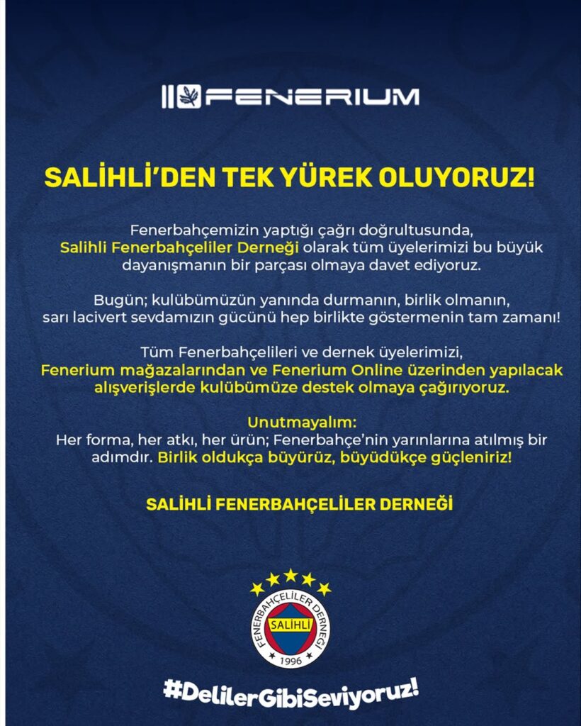 Fenerbahçemizin çağrısına destek veriyor, kulübümüzün yarınları için hep birlikte omuz omuza duruyoruz. Tüm üyelerimizi ve Fenerbahçe sevdalılarını;Fenerium mağazalarından ve Fenerium Online üzerinden yapılacak alışverişlerle kulübümüze katkı sağlamaya davet ediyoruz.