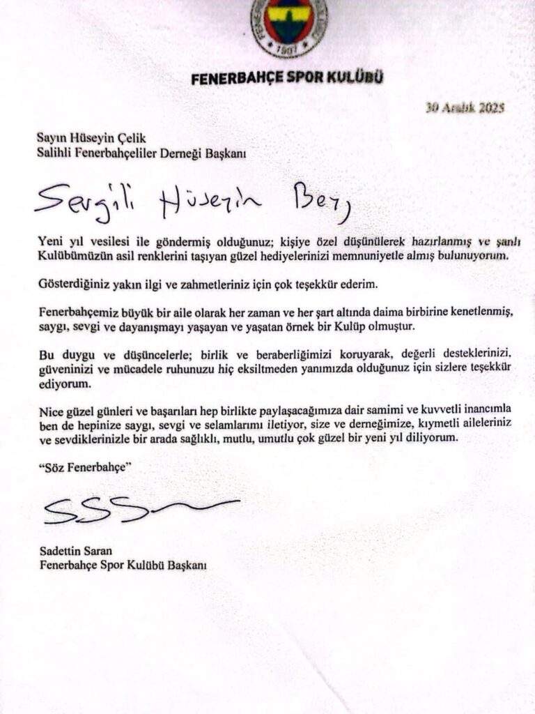 Derneğimiz tarafından iletilen hediyeye ilişkin olarak Sayın Başkanımızdan gelen nazik ve samimi mesajı memnuniyetle aldık. Göstermiş olduğu yakın ilgi ve içten ifadeler, Salihli Fenerbahçeliler Derneği için büyük bir değer taşımaktadır.